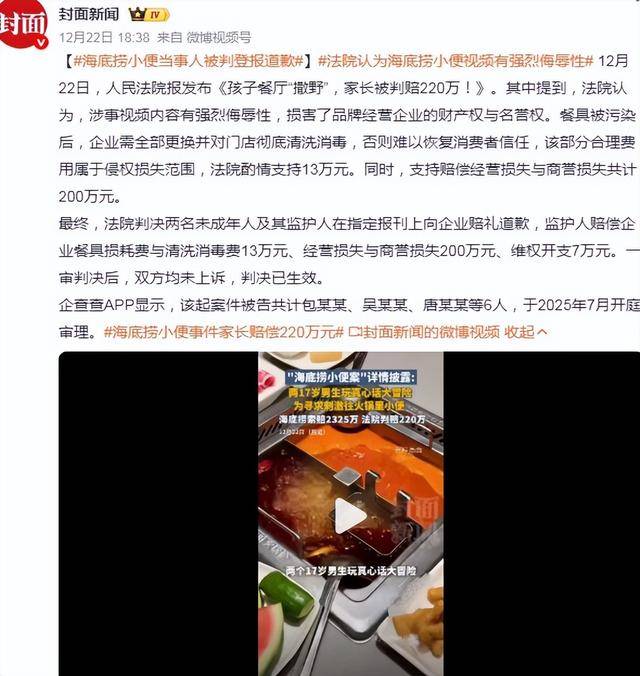 这场风浪以判决生效画上句号,但留给社会的思虑却远未竣事。对于阿谁“敢不敢再去海底捞”的问题,品牌方用雷霆手段和法令兵器给出了回应。这两位少年的父母,正正在用整个家庭的将来正在领取谜底。正在流量狂欢和寻求刺激之前,请先掂量一下,那条不成跨越的底线,事实价值几何。前往搜狐,查看更多。