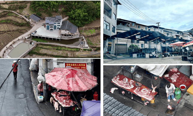 为了实地领会绥阳县存正在的私宰滥屠问题,记者一行颠末持续两天的实地暗访,了相关问题的实正在存正在。记者以外来旅客和加入赶集的消费者身份,别离对绥阳的旺草镇、茅垭镇、枧坝镇、宽阔镇和青杠塘镇进行了实地看望并进行近程无人机拍摄。正在这些镇里看到的屠宰点无一不是私宰滥屠场合。每个场合的规模很小,除大案板和挂肉钩、刀具外,几乎没有任何屠宰设备,也看不到什么像样的操做工人,杀猪人该当就是业从或其家人,打眼一看就属于私家开的屠宰场合。为了可以或许赶得上赶集日的早卖,每个店一般都是凌晨3点起头宰杀,大约5点来钟天还未亮时就完成了屠宰;接下来是屠宰委托户用小型车,大都还只是摩托车,将剔成的整猪,连同下水等一路运至市场;一辆摩托车的后座经加宽,一次约可运输平均活沉300斤以上的两端整猪杀出的肉;屠宰户则对宰杀现场进行快速冲刷清理,发生的废水多曲排进沟渠或河流,到了天亮时分,屠宰点已被清理得干清洁净,几乎看不出宰杀的踪迹。跟着市场正在早上的开张,镇(乡)的当地居平易近起头了采办。此中既有买一数斤肉的家庭散户,也有整扇采办或者包下全数排骨、后腿等肉食部位的大买从。取较大城市市场里见到的猪肉一个较着分歧是,这些猪肉的身上都是光秃秃的,完全看不到查验检疫部分敲上的任何验讫章;记者走访了不止10个肉摊,没有一个摊位有卖盖过了章子的猪肉。